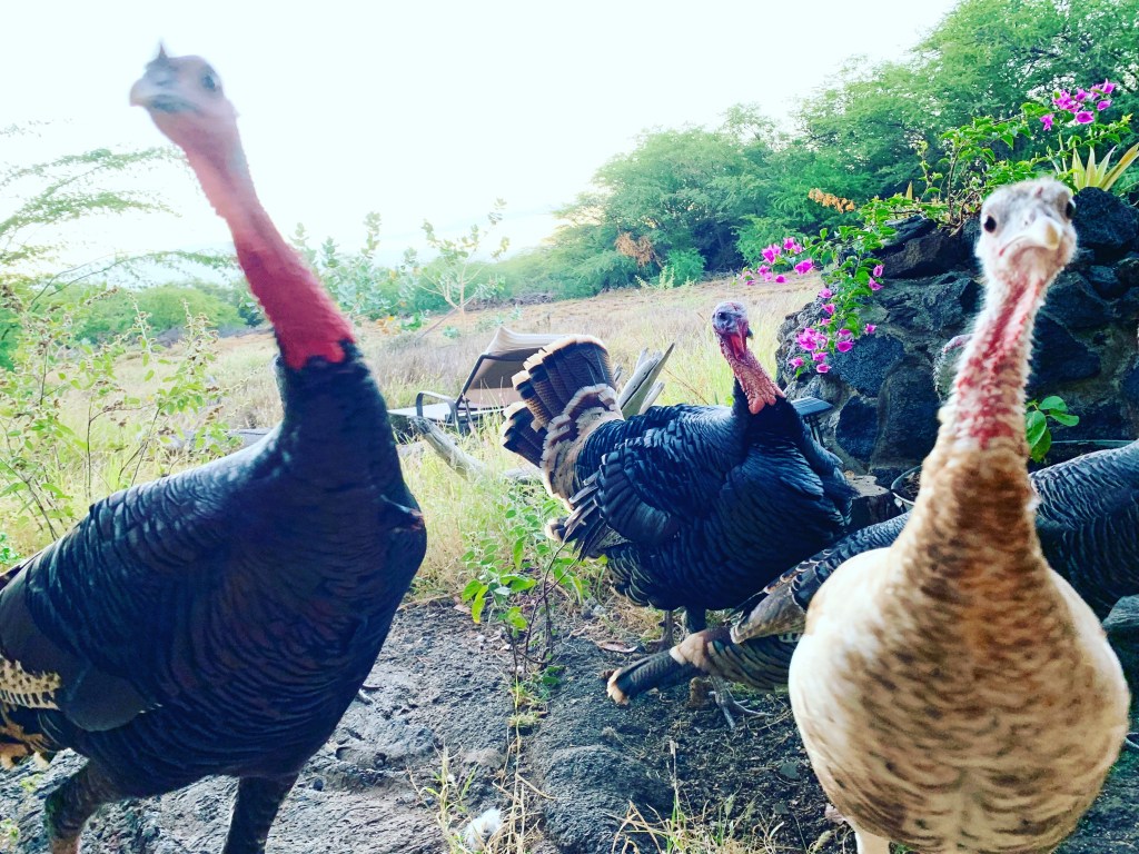 I live in a beautiful beachside community, Puako, on Big Island and we have a tribe of outgoing turkeys that fluff their feathers and strut their stuff around the neighborhood. I think they believe they come from royalty and it shows in their behavior.